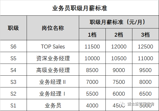 作爲刺向敵人(rén)心髒的(de)突擊手,業(yè)務員的(de)薪酬直接與個(gè)人(rén)新業(yè)務拓展情況挂鈎。業(yè)務員薪酬主要包含職級月(yuè)薪及業(yè)務提成兩部分(fēn),職級月(yuè)薪部分(fēn)每年年初根據業(yè)務員上(shàng)年度實際完成銷售收入情況設定業(yè)務員個(gè)人(rén)職級及薪級薪檔,激勵業(yè)務員不斷精進業(yè)務。