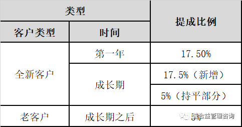 而業(yè)務提成則根據客戶類型及時間兩個(gè)維度共同确定毛利提成比例,在客戶簽入的(de)第一年,所有(yǒu)銷售額均采取17.5%的(de)毛利提成比例,而在成長期階段,新增銷售額均采取同樣的(de)高(gāo)提成比例,與往年持平部分(fēn)隻享受較低的(de)提成。成長期結束後,業(yè)務員則将客戶移交客戶經理(lǐ)進行(xíng)維護,此時業(yè)務員仍将享受此客戶的(de)延續性提成,但(dàn)比例較低。是否将客戶移交客戶經理(lǐ)的(de)決定權在業(yè)務員自身:當客戶短期内已經沒有(yǒu)成長性,但(dàn)是相(xiàng)關的(de)維護工(gōng)作又(yòu)不能(néng)放(fàng)松的(de)情況下,勢必對于開(kāi)拓新業(yè)務産生一定的(de)阻礙,此時何不脫手老客戶,專攻新業(yè)務?