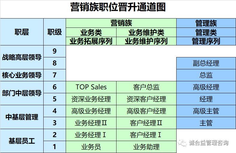在講提成之前,我們先捋一捋員工(gōng)的(de)基本工(gōng)資應該怎麽定,總不能(néng)所有(yǒu)人(rén)員基本工(gōng)資都(dōu)一刀(dāo)切吧(ba)?所以第一步應該是建立職位等級體系,按等級定薪。所以,依據劃分(fēn)的(de)拓新團隊與運營團隊,我們建立了兩條營銷族專業(yè)路(lù)線及一條管理(lǐ)路(lù)線,爲員工(gōng)提供雙通道發展的(de)路(lù)徑。