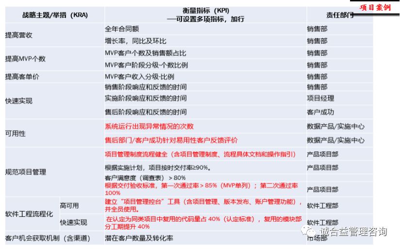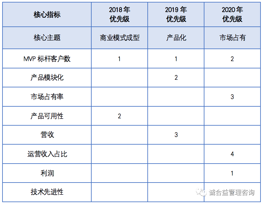 接下來,我們結合實際咨詢過程中類似的(de)戰略目标設定與執行(xíng)的(de)案例,分(fēn)享這三個(gè)方面操作的(de)一些經驗: 定目标:如(rú)何描繪、衡量和(hé)分(fēn)解戰略 平衡計(jì)分(fēn)卡理(lǐ)論創始人(rén)諾頓和(hé)卡普蘭兩位教授提出過:不能(néng)描繪,就不能(néng)衡量;不能(néng)衡量就不能(néng)管理(lǐ)。因此,定目标的(de)邏輯包含以下幾個(gè)部分(fēn): 1.規劃戰略發展階梯:明(míng)确公司3-5年戰略目标 在很多企業(yè),戰略規劃是一個(gè)很虛幻、停留在老闆腦(nǎo)子裏的(de)模糊方向,老闆似乎也(yě)很難跟團隊描述清楚,我們在咨詢輔導過程中經常通過“戰略發展階梯”這個(gè)環節的(de)討(tǎo)論,通過研討(tǎo)衡量未來三年戰略成功的(de)階段性目标的(de)方式,來快速澄清和(hé)達成共識。 比如(rú),下面的(de)咨詢案例是一家大(dà)數據技術(shù)公司,衡量公司2018年-2020年戰略成功的(de)核心指标每年都(dōu)不一樣,優先級順序也(yě)不一樣,這裏所體現的(de)就是每年核心聚焦事項或者說核心能(néng)力的(de)打造,有(yǒu)所取舍。